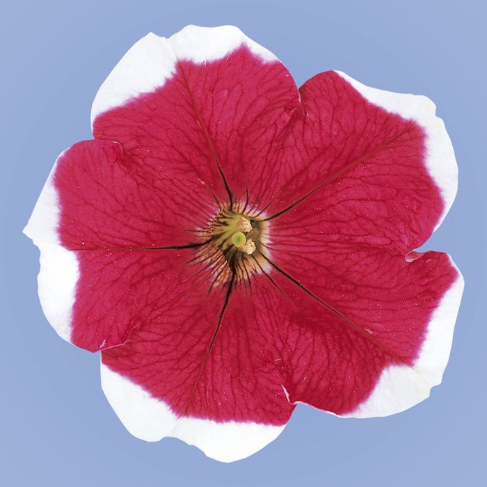 花弁が厚く丈夫で、雨による花傷みにきわめて強いのが自慢の中輪系品種です。開花が早く、コンパクトな草姿で開花、花色の豊富さも特徴です。 鮮やかな濃桃色に周縁部が白色。
