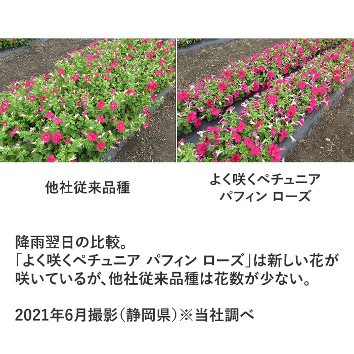 「よく咲くペチュニア パフィン」は同病害への強さと、花弁がダメージを受けた後の回復の早さ(次の花が咲く早さ)に優れ、大輪系品種でありながら雨への強さを両立した画期的な品種です。