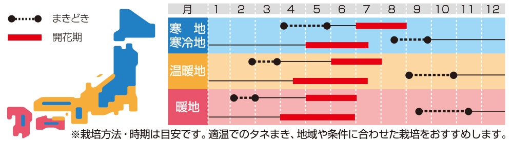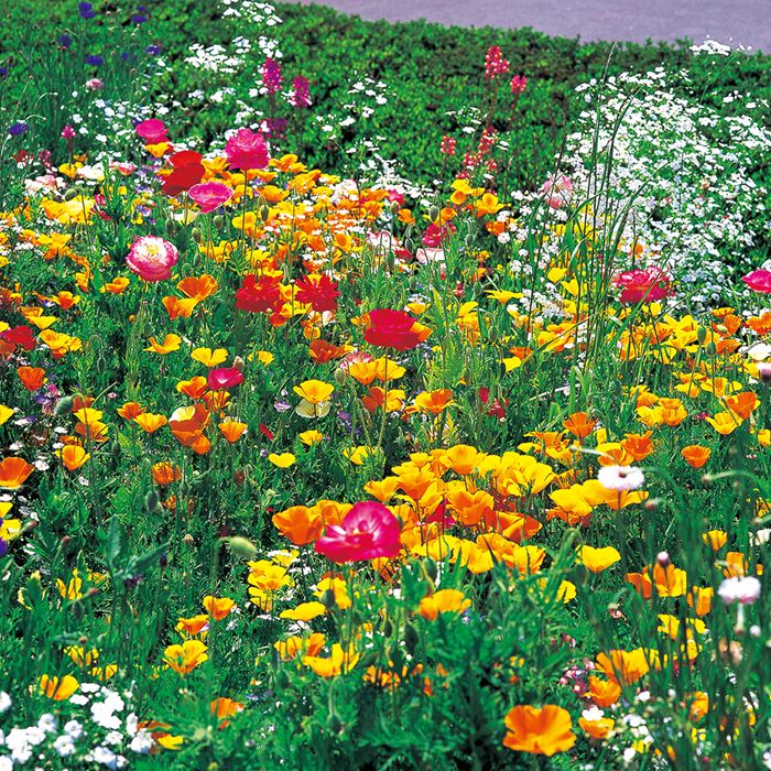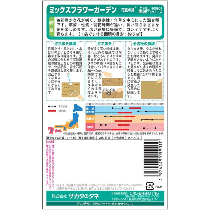花壇や鉢に直接タネをまいて楽しむことができる、育苗の手間がかからない草花。花色ごとに多彩な品種をミックスした絵袋です。1袋でそれぞれの同系色コーディネートができます。何が咲くかは育てた方のお楽しみ! ガーデンを輝かせる色合い!