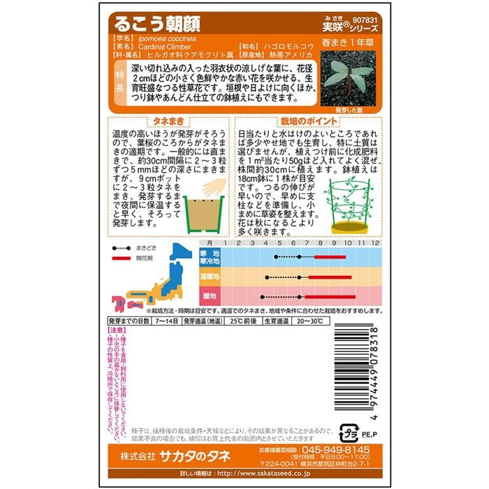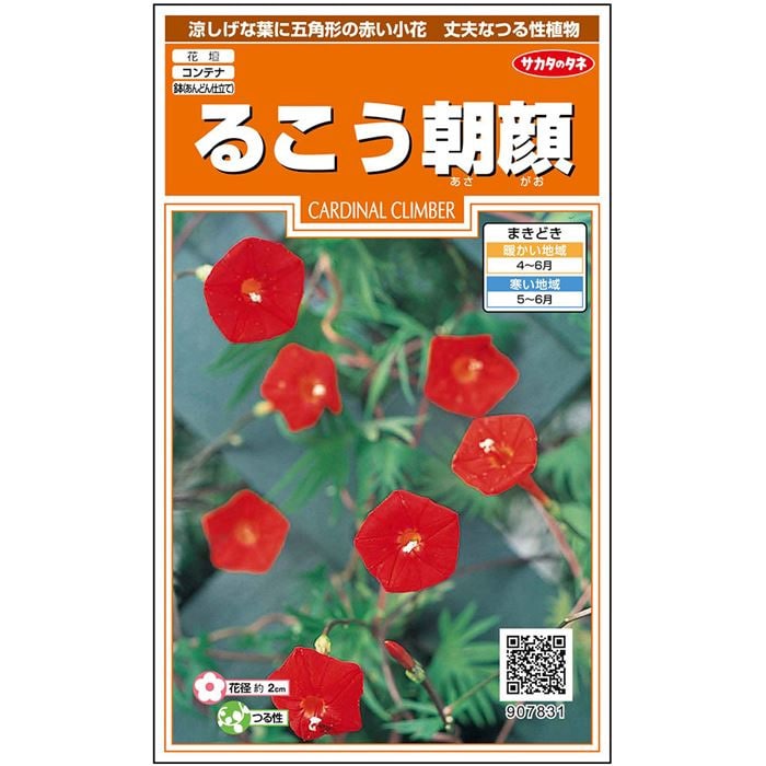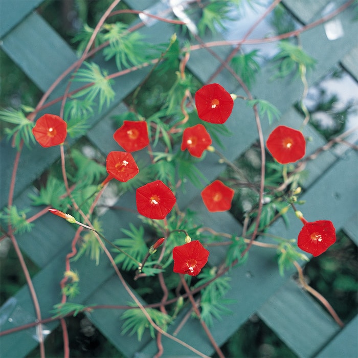 深い切れ込みの入った羽衣状の涼しげな葉に、花径約2cmの小さく色鮮やかな赤い花を咲かせる、生育旺盛なつる性草花です。