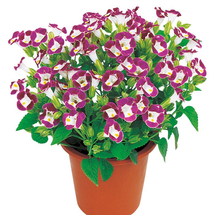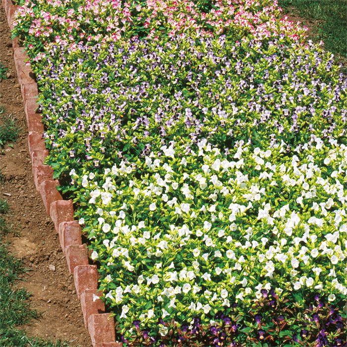 白色に濃紫桃色の覆輪です。美しい色のコントラストが特徴です。一代交配品種のわい性早生品種です。分枝が多く、花壇で見事な大株となります。