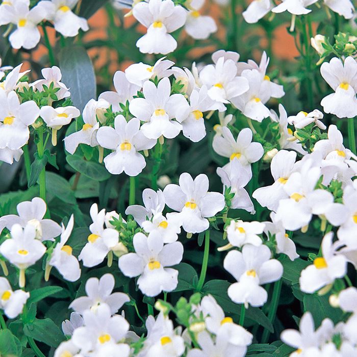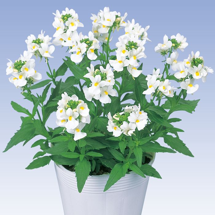実生系のわい性宿根ネメシア。秋から春まで幅広く出荷可能で、丈夫な性質です。夏播きで秋からコンパクトな草姿で開花を始め、花つきよく、花壇にも好適です。パンジーと同時期に出荷できる商材として有望です。若干の個体差がでます。