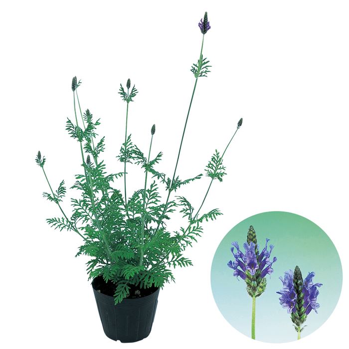 ムルティフィダ種タイプで、流通名は「レースラベンダー」です。生育旺盛で、標準管理では播種後約90日で開花を始め、耐暑性もあります。開花丈は約30cmで、葉には細かい羽状の切れ込みがあります。