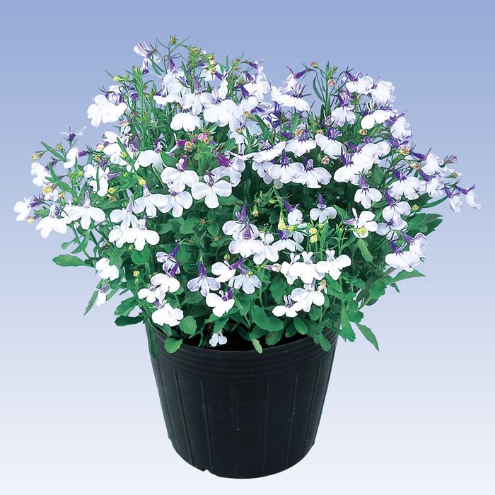 わい性早生品種で枝が伸びず株の乱れがないため、株間が狭くても管理可能で、花つきよく栽培が容易です。小鉢栽培にも適します。白色に青色の複色。