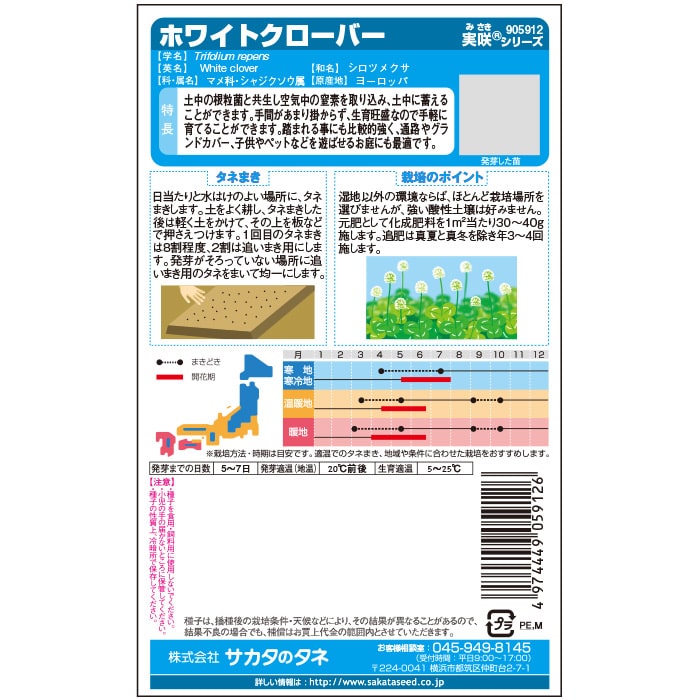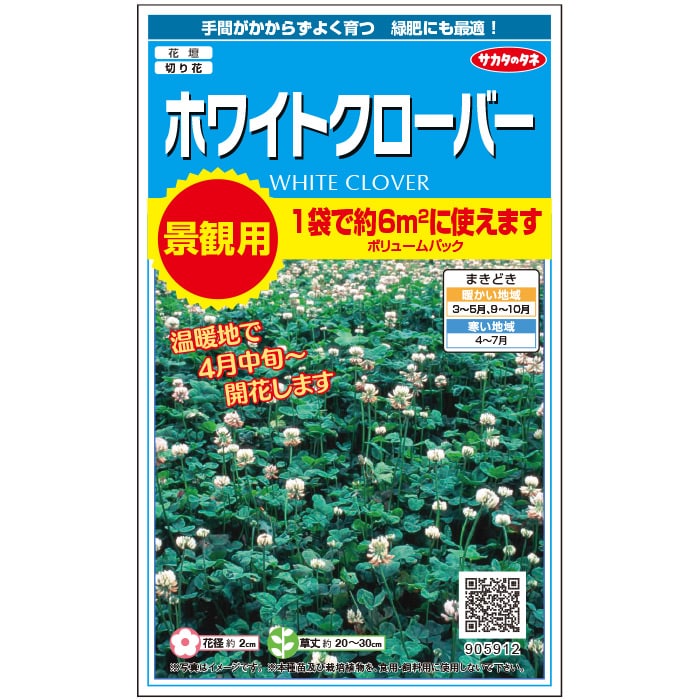 土中の根粒菌と共生し空気中の窒素を取り込み、土中に蓄えることができます。手間があまりかからず、生育旺盛なので手軽に育てることができます。踏まれることにも比較的強く、通路やグラウンドカバー、子どもやペットなどを遊ばせるお庭にも好適です。冷涼で湿潤な気候を好みますが、耐暑性もあり、全国的に栽培しやすい種類です。