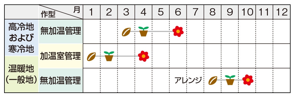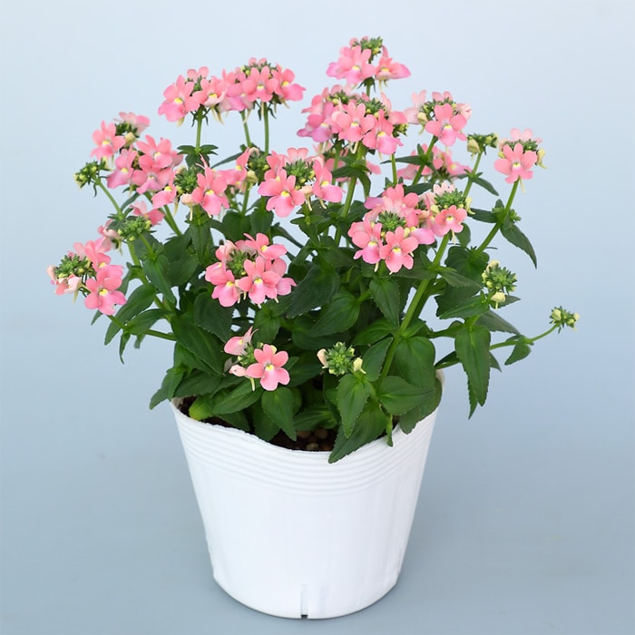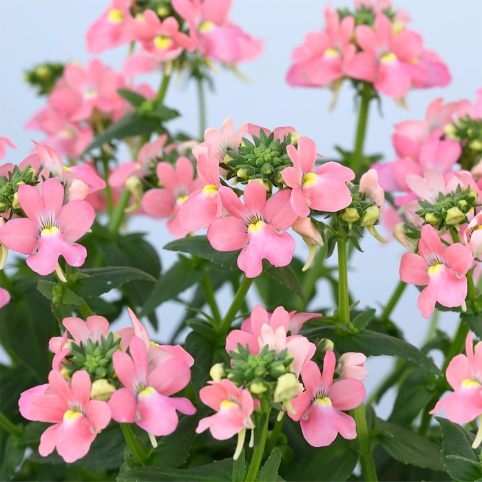 実生系のわい性宿根ネメシア。秋から春まで幅広く出荷可能で、丈夫な性質です。夏まきで秋からコンパクトな草姿で開花を始め、花付きよく、花壇にも好適です。パンジーと同時期に出荷できる商材として有望です。若干の個体差がでます。