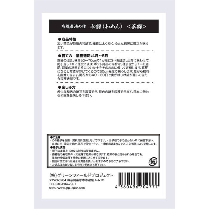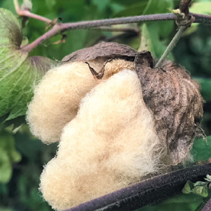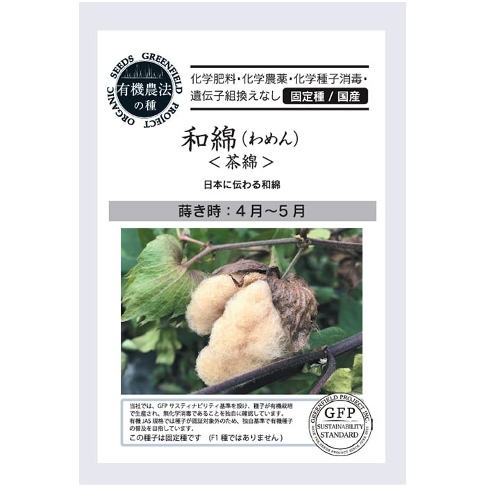 淡い茶色が特徴の和綿で、繊維は太く短く、ふとん綿等に適正があります。有色綿などの在来種は病害虫や乾燥に強く、栽培に多くの肥料を必要としません。無農薬・無化学肥料での有機栽培に比較的適性があります。