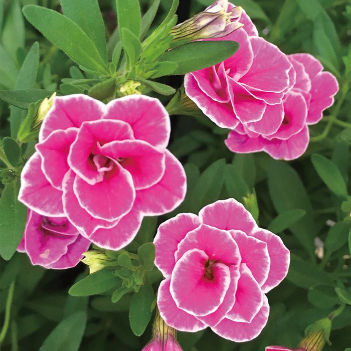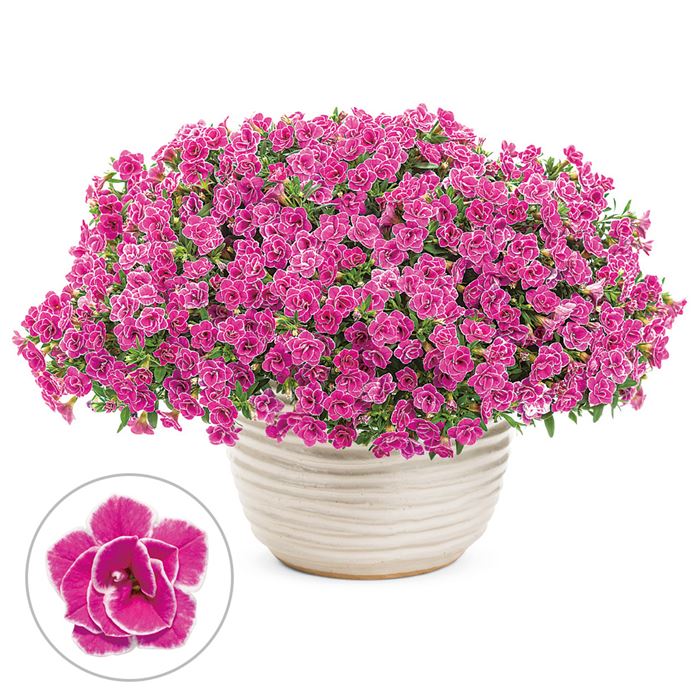 ダブル(八重咲き)の花弁に白いエッジが特徴的なかわいらしい花です。白いエッジが入ることにより、花弁の重なりがより印象的になります。「スーパーベル」の特長である花付きのよさや耐暑性もあり、まとまりのよい草姿に生育するおすすめの品種です。