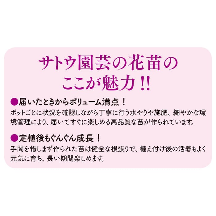 花苗作りの達人、サトウ園芸の佐藤勲さんが育てた高品質の苗でのお届けなので、植え付け後の生育が驚くほどスムーズです。初心者でも上手に栽培できます。