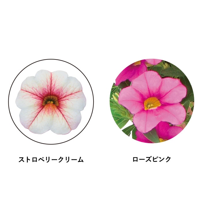 優しい色合いの「ストロベリークリーム」と、インパクトの強い「ローズピンク」の華やかな組み合わせ。お互いの花色を引き立てます。