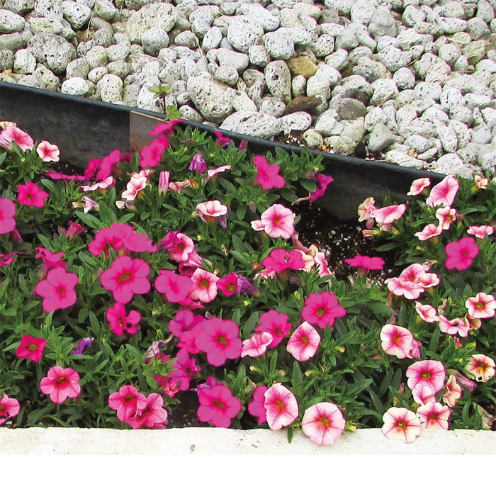 佐藤さんが作る苗はどれもボリュームたっぷりで根も元気いっぱい、植え付けたらぐんぐん生育する担当者イチオシの商品! 「ふわリッチ」を使った2色植えを仕立てていただきました。個性的な「ストロベリークリーム」と、かわいい花色の「ローズピンク」がバランスよく育ち、次々に花を咲かせます。