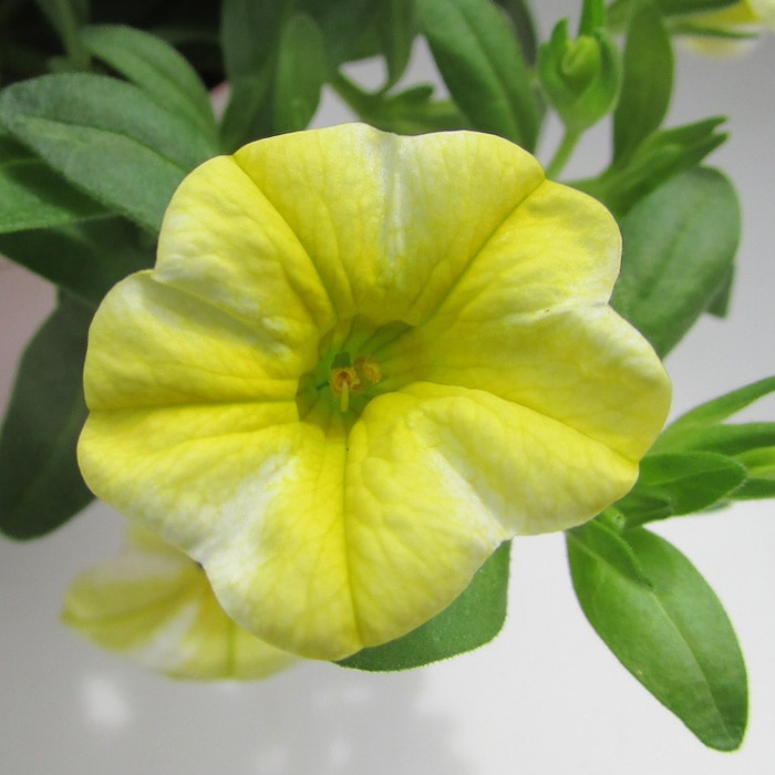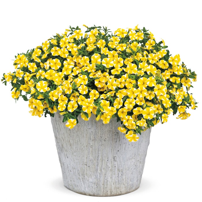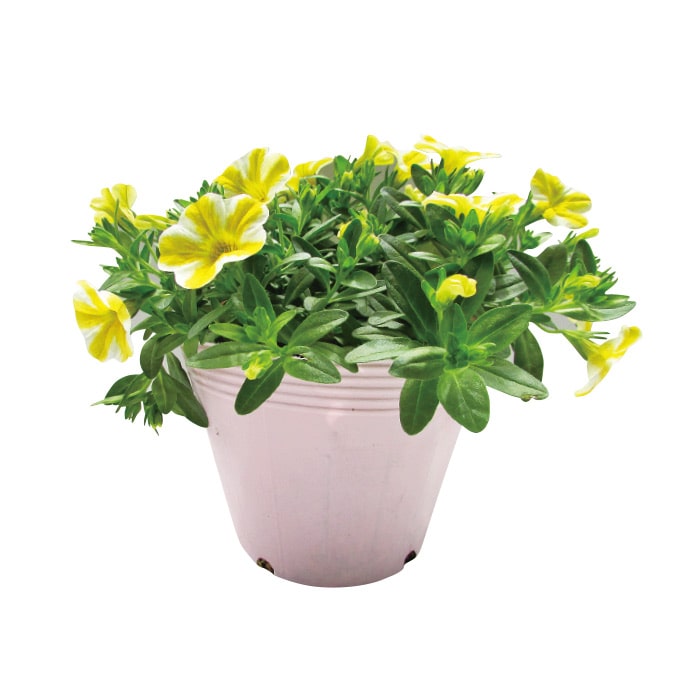 ストライプ模様が入ったカリブラコア。レモンをスライスしたような模様が印象的。サトウ園芸さんが作った高品質な苗で、植え付け後すぐに花を楽しめます。株張りは最大で40~60cm程度です。