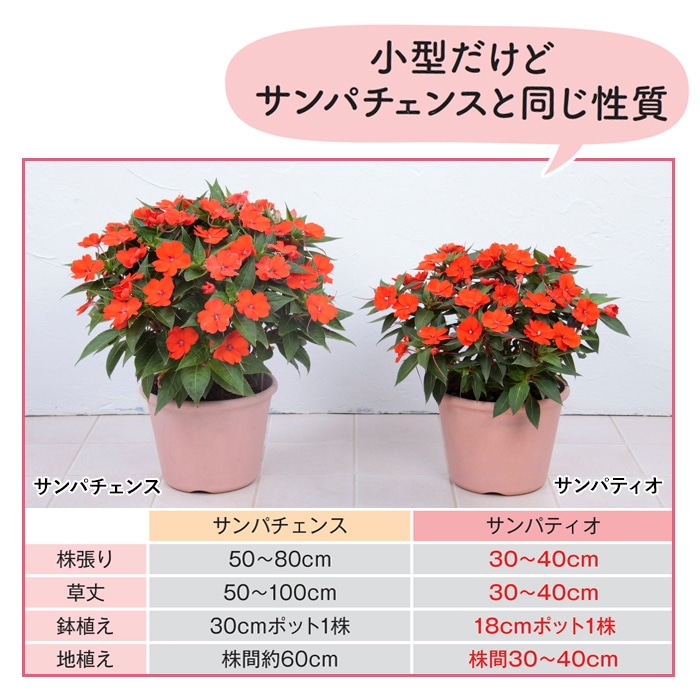 ・「サンパチェンス」の姉妹シリーズです。8号鉢で植えた場合、従来の「サンパチェンス」が1株で草丈約50cmに成長するのに対し、「サンパティオ」は小ぶりで、約30cmとよりコンパクトな草姿になります。
