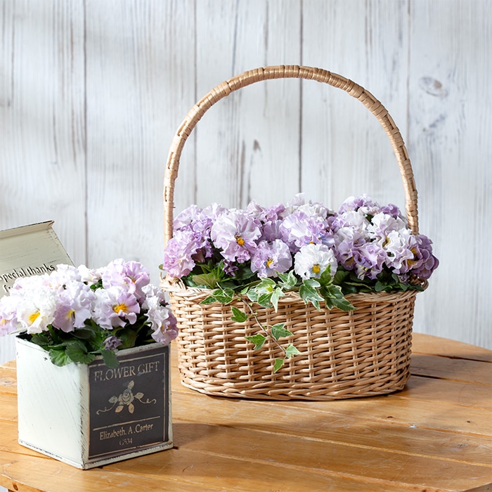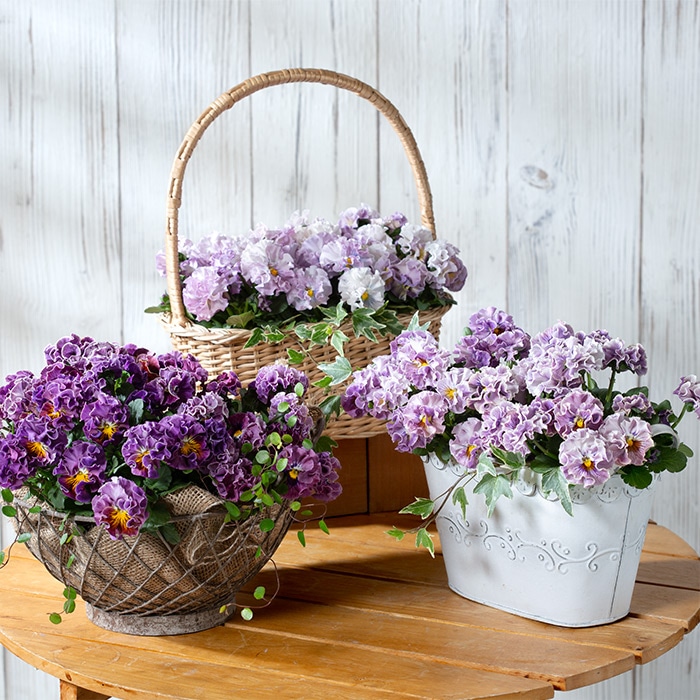フリンジの繊細さや、色のグラデーションが醸し出す雰囲気は「ポンゼヴェールCOCO」ならではです。花付きもよく、すてきな空間を演出してくれます。花にフリンジのあるビオラは、花首が上に伸びることが多いですが、「ポンゼヴェールCOCO」は、花首が短く、株全体も立ち上がらないため、まとまりのよい花束のような株姿に仕上がります。
