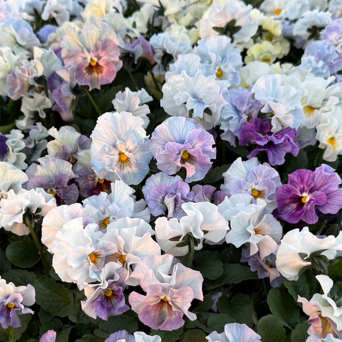 波打つフリル咲きの中大輪パンジー。シエルブリエ(Ciel Briller)は、フランス語で「空」を意味する「Ciel」と、「輝く」「光る」を意味する「Briller」を組み合わせた言葉です。色幅があるのでお気に入りのカラーがきっと見つかりますよ!暑い時期は花色が濃く、寒い時期は薄くなるなど、環境によっても花色が変化していきます。また、肥料のやり方でも花色が変わりますよ。耐寒性は一般的なパンジー・ビオラと変わらないくらいで、冬でも開花します。春になるとさらに株が大きくなります。