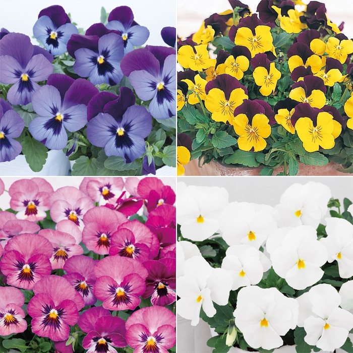 - パンジー 「よく咲くスミレ スイートポテト」、パンジー 「よく咲くスミレ ラムレーズン」、パンジー 「よく咲くスミレ マシュマロ」 、ビオラ 「ピエナ ピーチ」