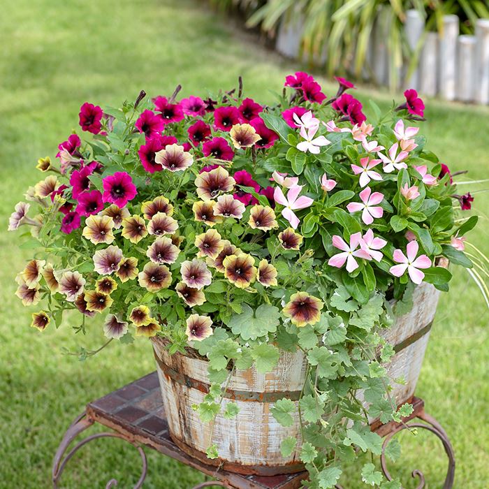 寄せ植えイメージ (左奥)ペチュニア かさねいろ マジェンタ (左前)ペチュニア かさねいろ イエロー&バイオレット