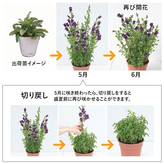 花が咲き終わった後、切り戻しをするときに、先に伸びた花茎を切り、新たに伸びてきた芽を残すように切り戻しをすると盛夏前に再び咲かせることができます。