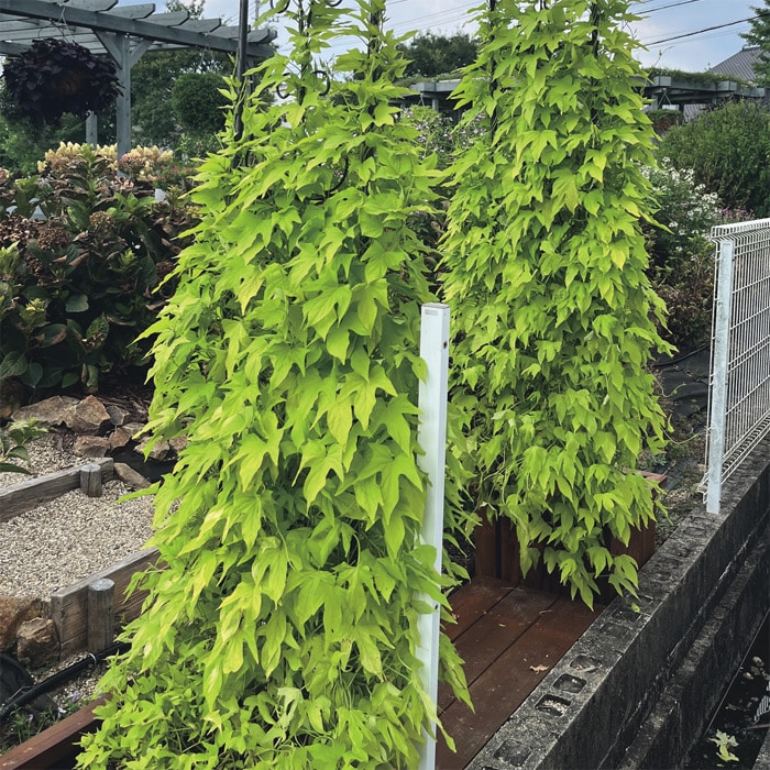 緑のカーテンのみならず、鉢植え、ハンギングバスケット、花壇植えなど幅広く使える夏のリーフ素材です。
