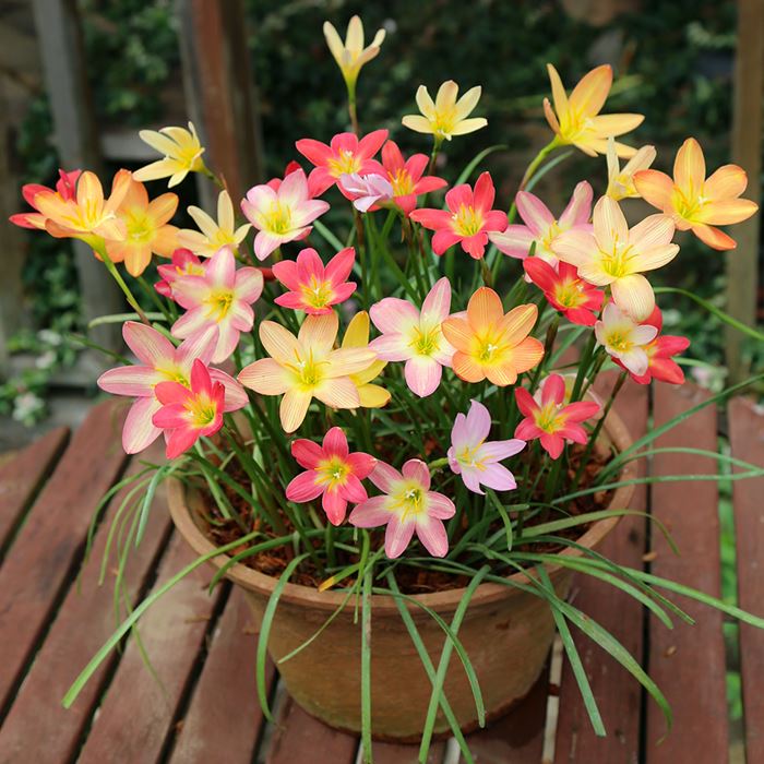 開花がそろいやすく草姿も同じで、カラフルな組み合わせです。