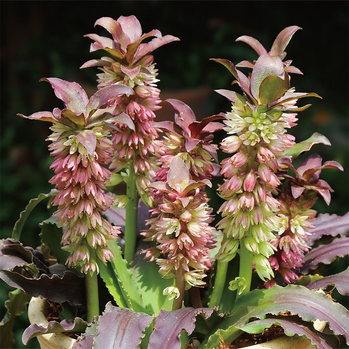 チョコレート色の黒に始まり紫に発色する葉とバイカラーの花が印象的な小型種。