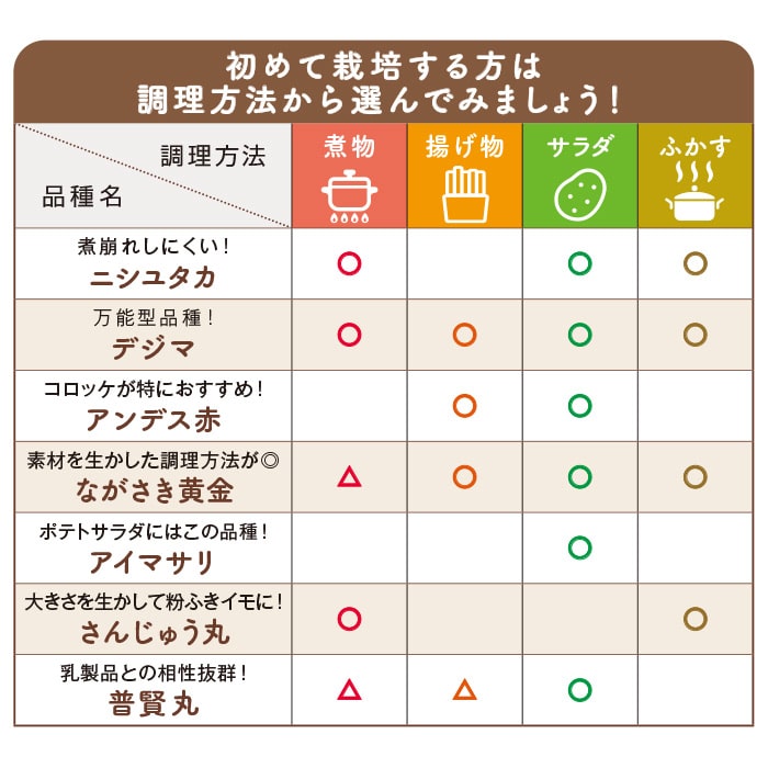 秋植えジャガイモの中でも主力品種の一つ。作りやすく生育が早いため、初めてジャガイモを栽培する方にもおすすめです。サラダやコロッケ、煮物に合います。