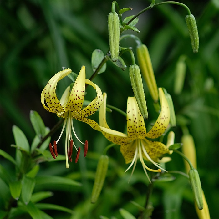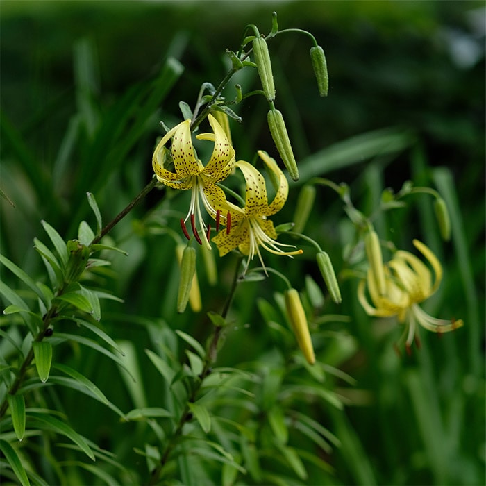 オニユリの変種として誕生したのが「黄金オニユリ」花弁は強く反り返り、黄地に赤褐色の斑点があるのが特徴。