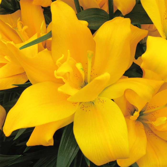 八重咲きのスカシユリで、茎が硬く花は上向き。作りやすく切り花にも最適です。