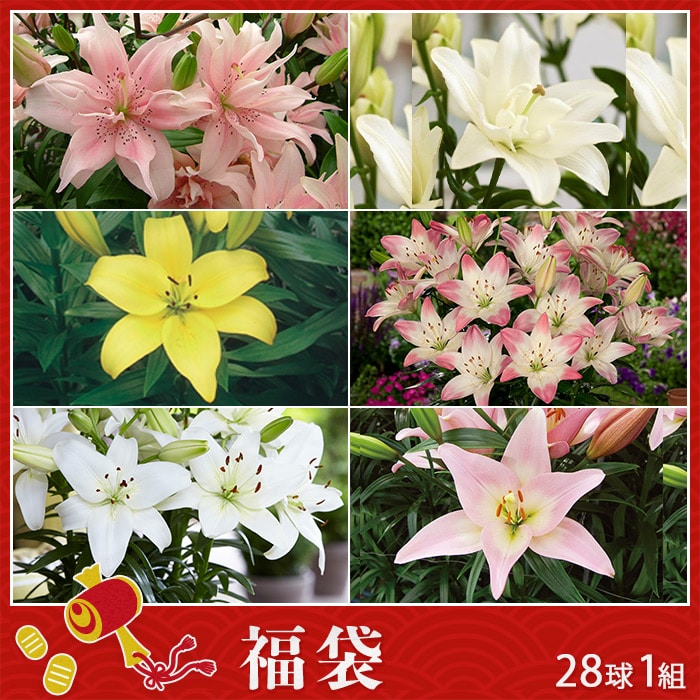 人気のスカシユリの球根を6種28球、品種名称付き見計らいでお届けする、お買い得な福袋です。