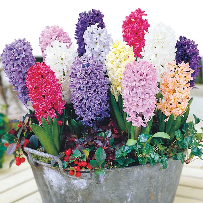 花色が豊富なヒヤシンスを7色集めたミックス商品です。美しい小花をたくさん付けるヒヤシンスは、春の花壇や水栽培で部屋に飾るにはぴったりです。