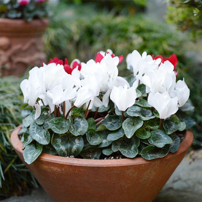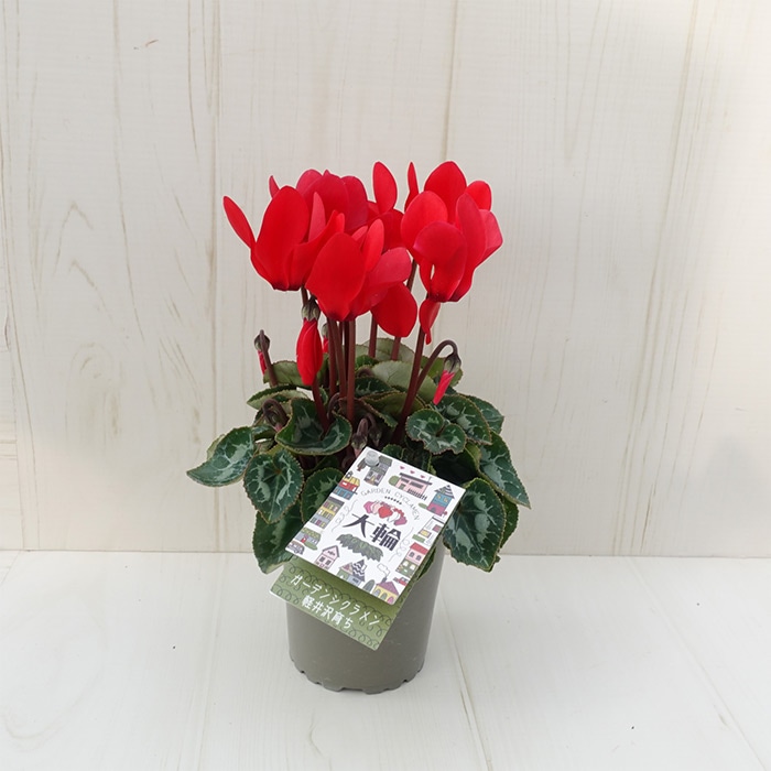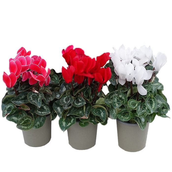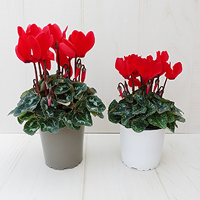花姿にボリュームがあり存在感が際立つ中大輪品種です。ミニ品種で高さが物足りない、大きいプランターに植え付けしたいときにおすすめです。株が一回りから二回り大きくなりますので通常のガーデンシクラメンよりも株間を広めに植え付けしてください。「 ガーデンシクラメン カーニバル 3色セット」とも合わせて植えられます。