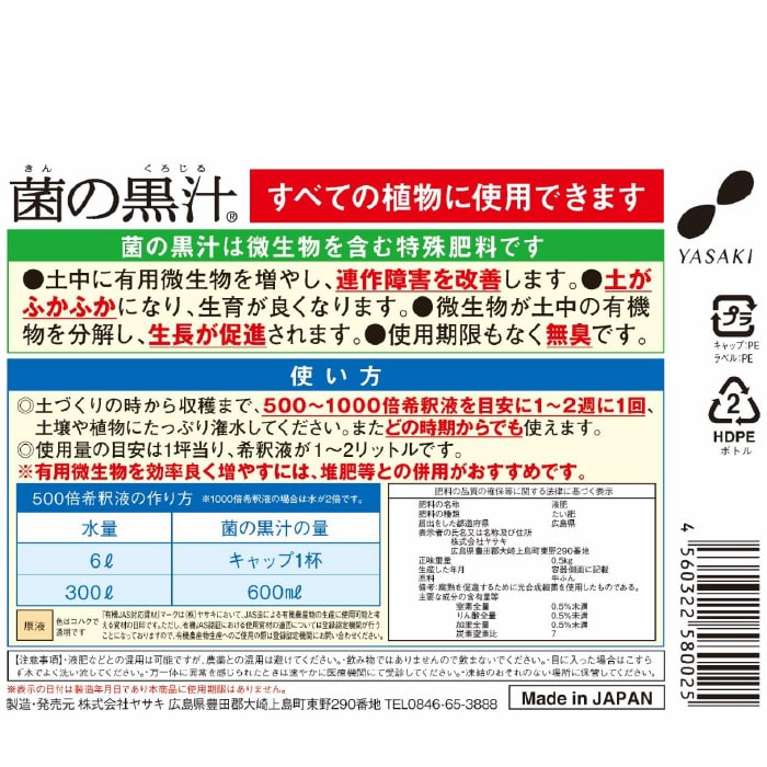 原料の有効微生物が、野菜や草花の成長を助けるふかふかの土をつくります。有機液肥と併用することで、花付きがアップします。また、有効微生物が多い土で育てると、病気になりにくく、丈夫な植物に成長します。500~1000倍に希釈して、株元や葉面に散布。多少かけ過ぎても影響はないので安心です。