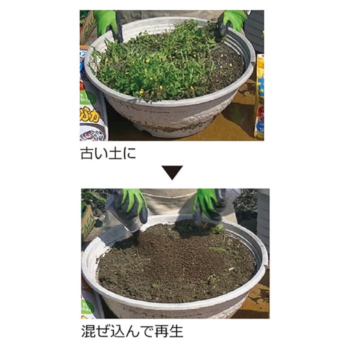 安心・安全、混ぜるだけでふかふかに土を再生します。有機の再生力で効果が持続し、再生後すぐに苗が植えられます。