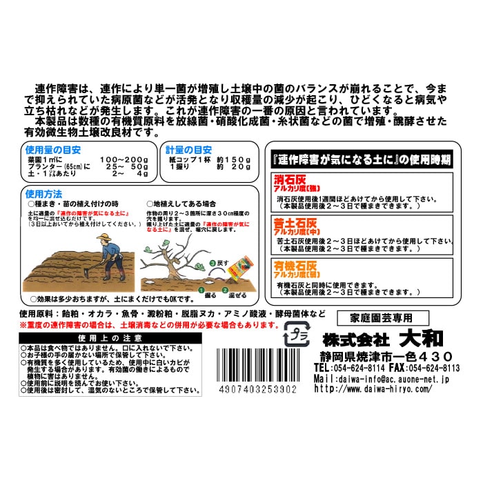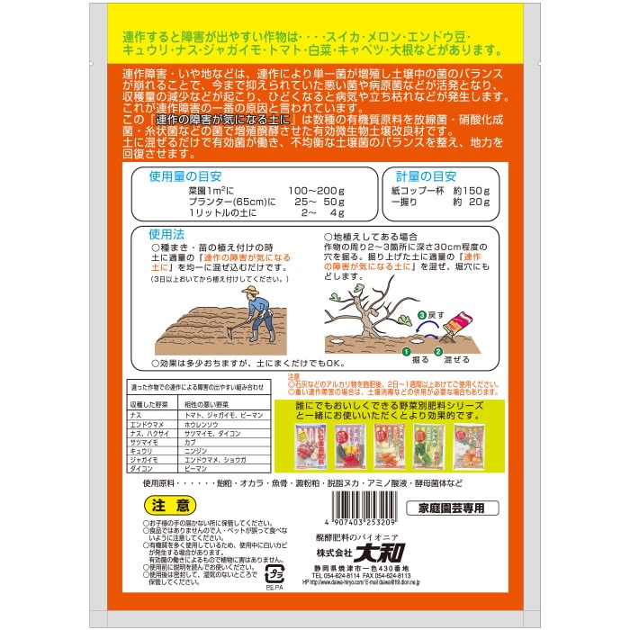 使用量の目安:プランター(65cm)に25~50g、菜園1㎡に100~200g