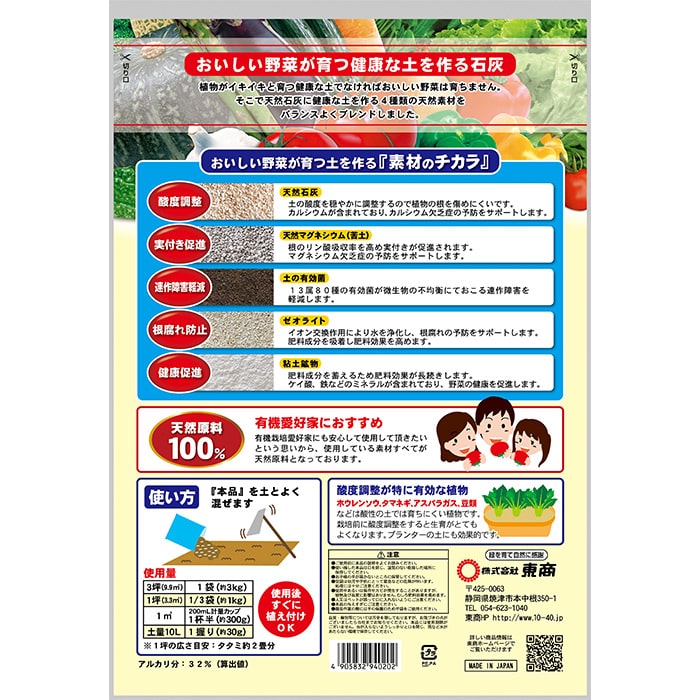 植物がイキイキと育つ健康な土でなければおいしい野菜は育ちません。そこで天然石灰に健康な土をつくる4種類の天然素材をバランスよくブレンドしました。