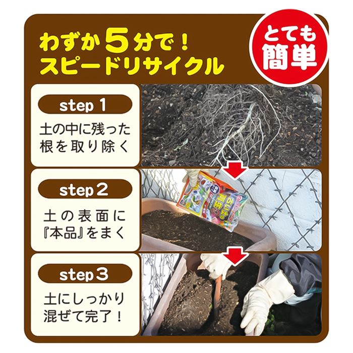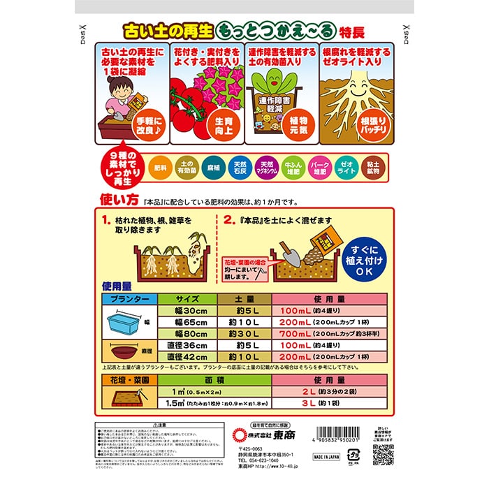 使用方法:植物を植え付ける前に古い土とよく混ぜます