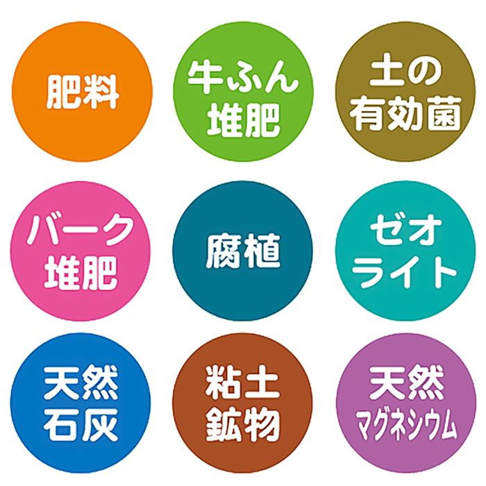 ●9種類の素材で古い土をしっかり再生します。【配合素材】肥料、土の有効菌、腐植、天然石灰、天然マグネシウム、牛ふん堆肥、バーク堆肥、ゼオライト、粘土鉱物