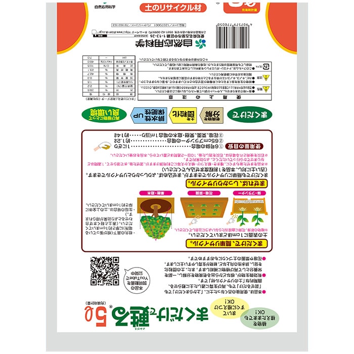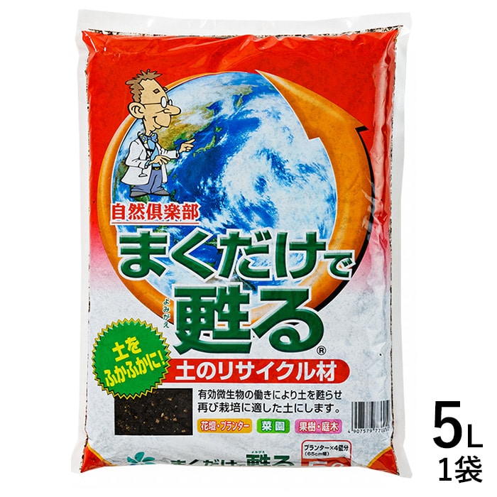 使用後の古くなった土に、「上からまくだけ」でも「混ぜるだけ」でも、再び生育に適した土によみがえらせる、画期的な「土のリサイクル材」です。有効微生物が、根などから出る老廃物を分解し、一部を栄養分として再び植物に補給します。また、土の団粒化を促し、排水性の向上など、植物が生育しやすい土にします。花壇や菜園の土づくりにもおすすめです。5L1袋は65cmプランター約4個分、14L1袋は1㎡が使用の目安になります。