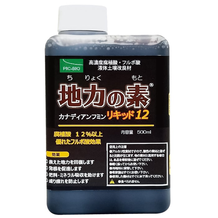 使いやすい液体タイプ。完熟堆肥の10倍のフルボ酸パワー。水やり時に希釈して根と土に刺激を与え、養分吸収力を高め生育を促進します。