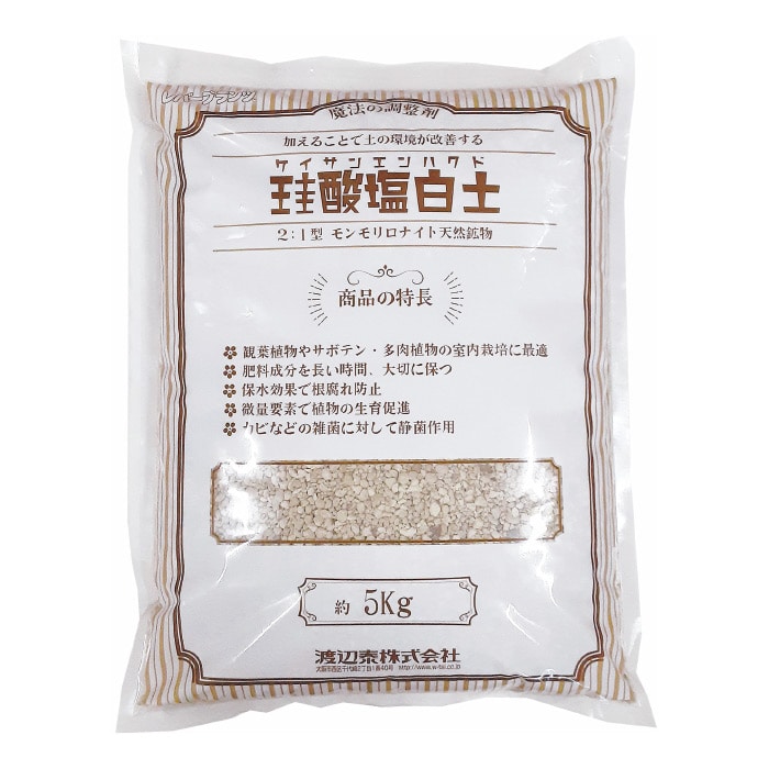 天然鉱物の「ケイ酸塩白土」です。土に加えることで、肥料成分やミネラルを長い期間保ちます。また、土の団粒化を促進し、透水性・通気性を改善します。保水効果も高く、根腐れ防止につながるのも特長です。