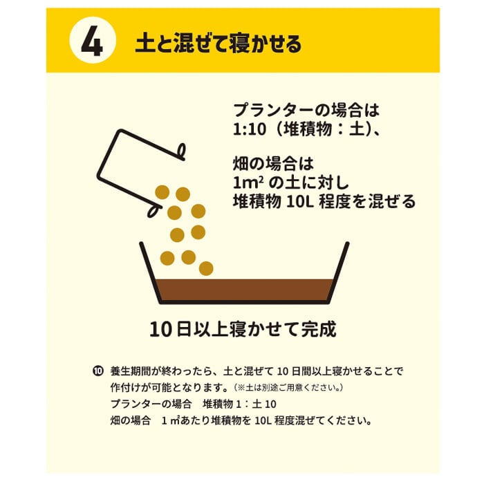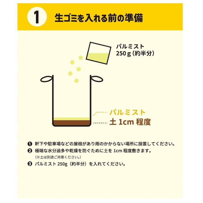 処理キットとパルミスト(発酵処理剤)4袋がセットで初心者の方でも簡単に堆肥づくりが始められます。