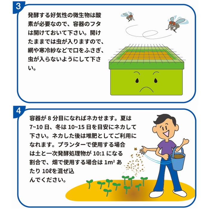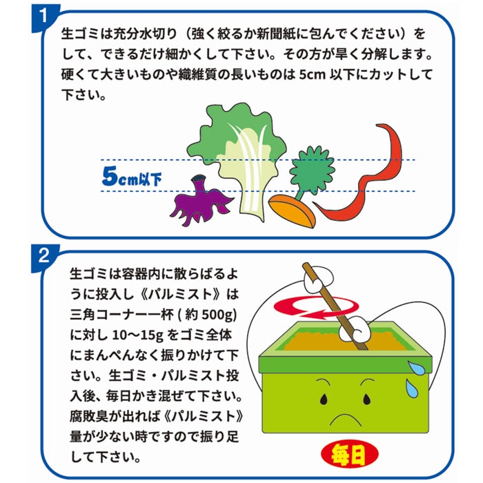 専用のコンポスト容器「かんたんコンポストBAG2」に生ごみを投入して、パルミストを振りかけるだけで堆肥づくりができます。