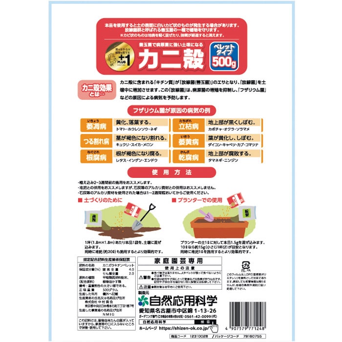 カニ殻効果とは…カニ殻に含まれる「キチン質」が「放線菌(善玉菌)」のエサとなり、「放線菌」を土壌中に増加させます。この「放線菌」は病原菌の増殖を抑制し、「フザリウム菌」などの原因による病気を予防します。