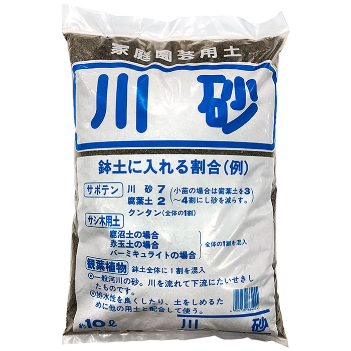 川を流れて下流に堆積した一般河川の砂です。排水性をよくしたり、土を締めるために他の用土と配合して使用します。多肉植物やサボテン、芝の目土用としておすすめです。