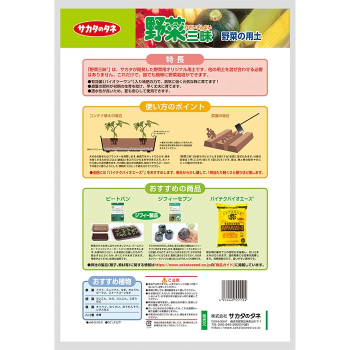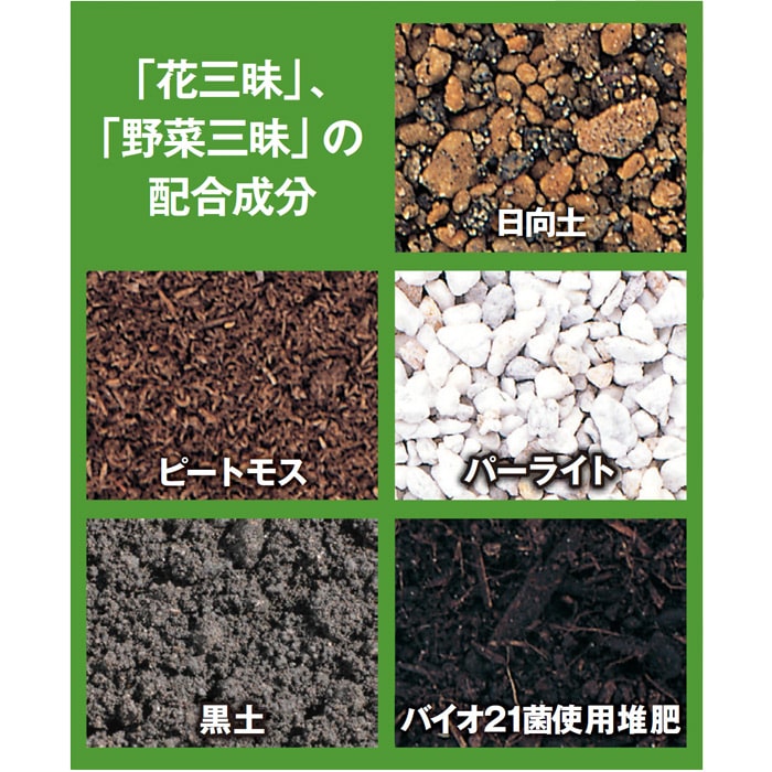 夏季、高温多湿の地域でも丈夫に育つよう、「水はけ」と「水持ち」のバランスを兼ね備えた用土です。約1カ月分の初期肥料が入っているので、後は苗と鉢があれば誰でも簡単に植物栽培がスタートできます。用土を改良する効果を持つ有効微生物「バイオ21菌」を使用した堆肥を含み、安心してお使いいただける野菜用土です。葉菜、果菜、根菜など野菜全般に。もちろん食べて楽しむハーブにも、手軽にそのまま使えます。