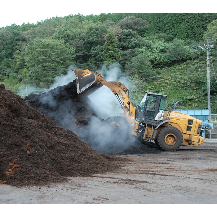 堆肥をかき混ぜるシーン(発酵の過程で生まれた熱が白煙状に発生している)