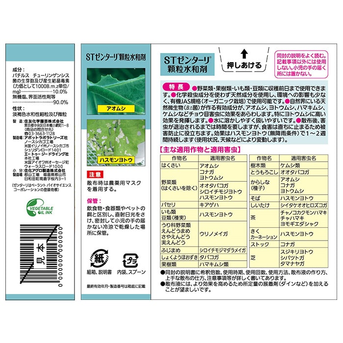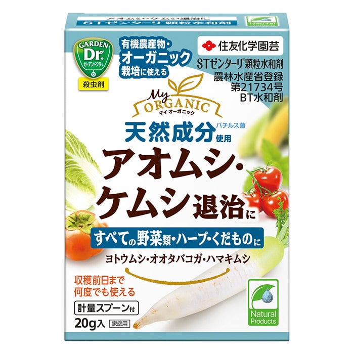 自然界にいる天然微生物(B.t.菌)が作る有効成分が、アオムシ、ヨトウムシ、ハマキムシなどチョウ目害虫に効果を表します。