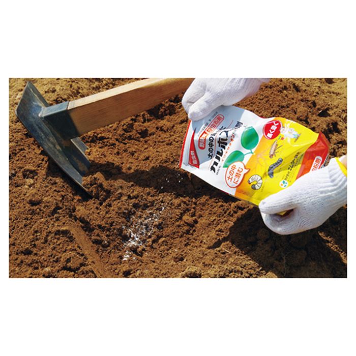 接触毒によりネキリムシやコガネムシの幼虫に有効です。粉剤タイプでそのまま使えます。
