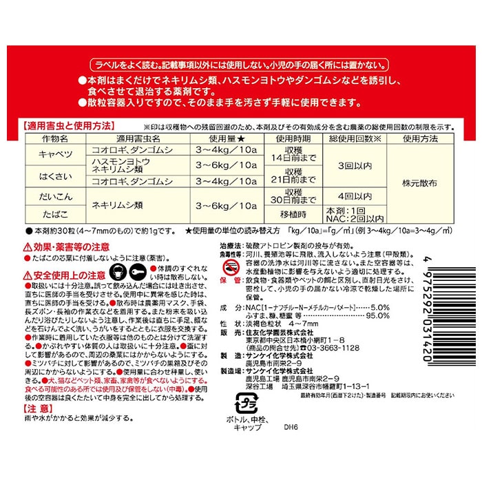 地際の茎を食害するネキリムシや新芽などを食害するダンゴムシ、ハスモンヨトウなどに効果があります。まくだけで害虫を誘い出し、食べさせて退治する誘引殺虫剤です。