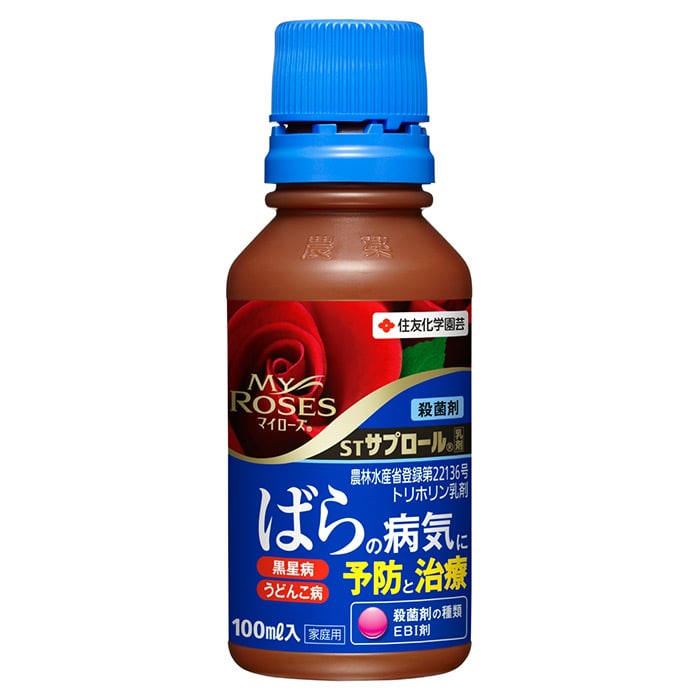 病気の予防効果と葉の中に侵入した病原菌まで退治する治療効果を兼ね備えた殺菌剤です。特に防除の難しい、バラの黒星病に優れた効果を発揮し、各種植物のうどんこ病やさび病にも効果があります。乳剤のため計量しやすく、また散布後の葉の汚れも少なく花(バラ、キク)の観賞価値をそこないません。